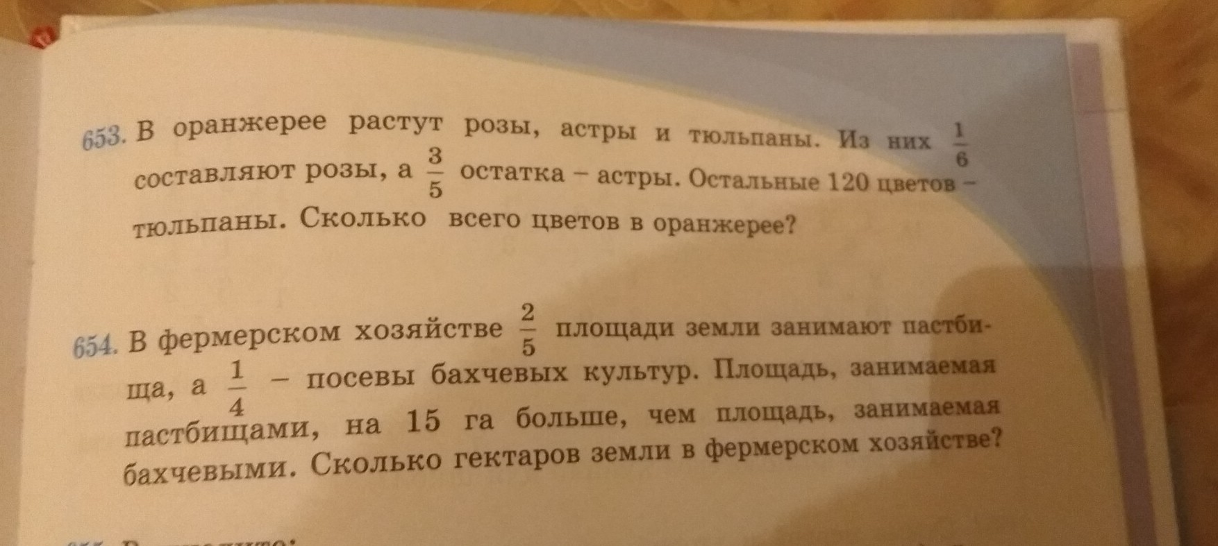 Помогите пожалуйста сделать номер 653,654. Чтобы получилось в 1 (653 номер) задаче - 360 цветов, а во 2 задаче (654 номер) получилось - 100 га.