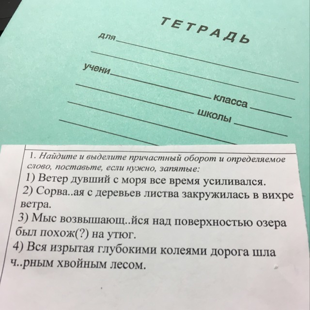 1) Ветер*, |дувший с моря|, всё время усиливался. 2) |Сорванная с деревьев| листва* закружилась в вихре ветра. 3) Мыс*, |возвышающийся над поверхностью озера|, был похож на утюг. 4) |Вся изрытая глубокими колеями| дорога* шла чёрным хвойным лесом.