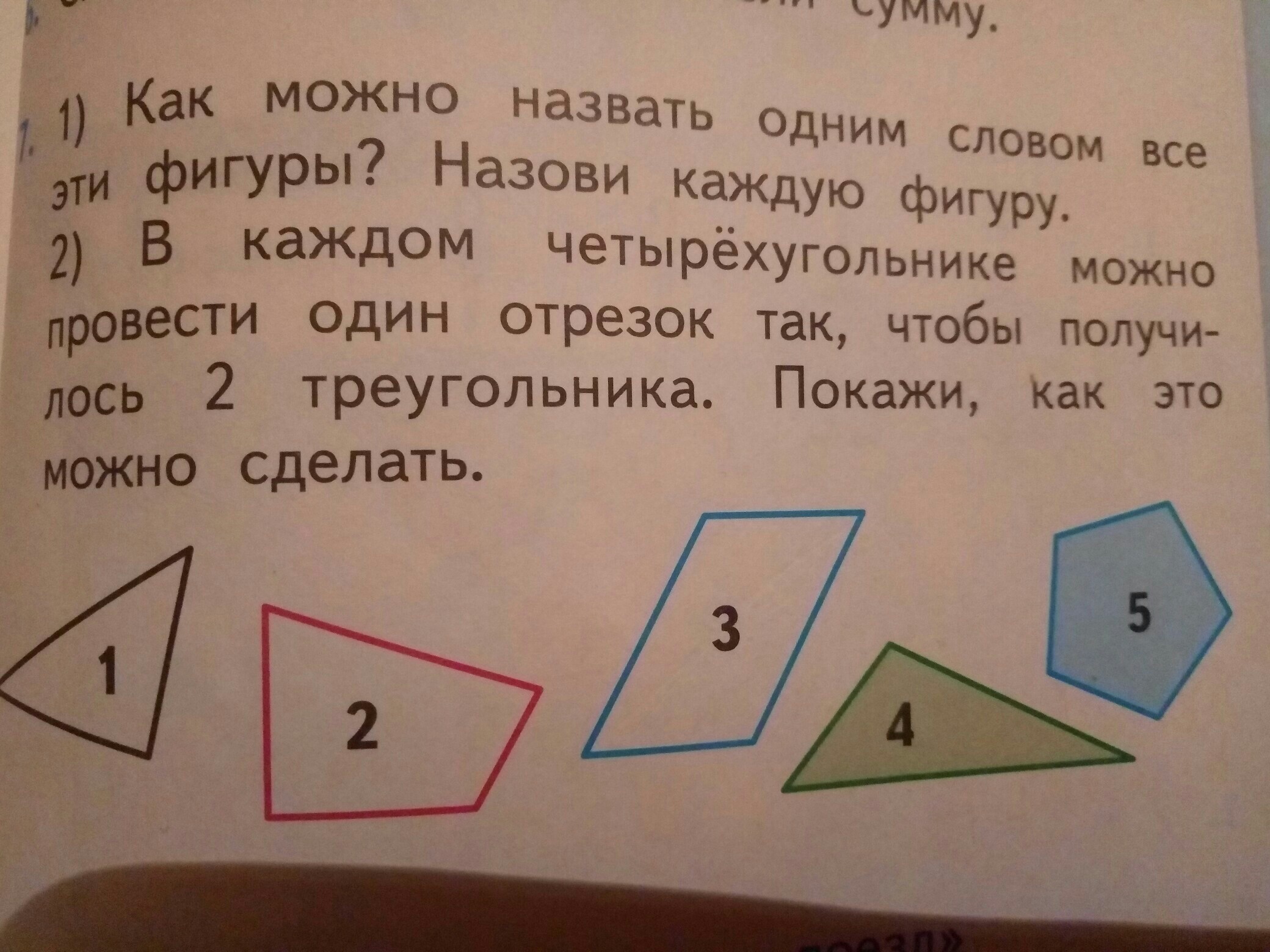 Геометрические фигуры : 1. треугольник, 2. четырехугольник, 3. четырехугольник, 4. трехугольник, 5. пятиугольник.