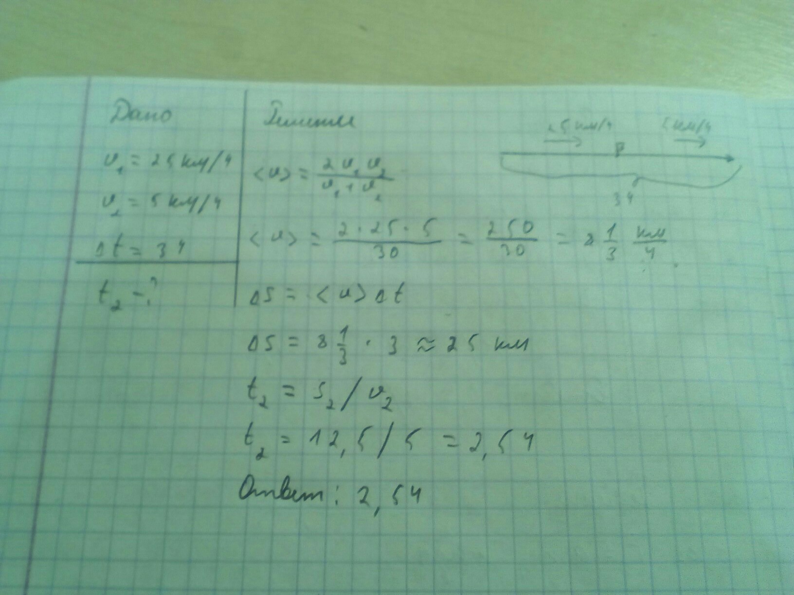 человек полпути проехал на велосипеде со скоростью 25 км/ч , а остаток пути прошел со скоростью 5 км/ч . Сколько времени он шел , если весь путь занял 3ч ?Надо решить не уравнением.