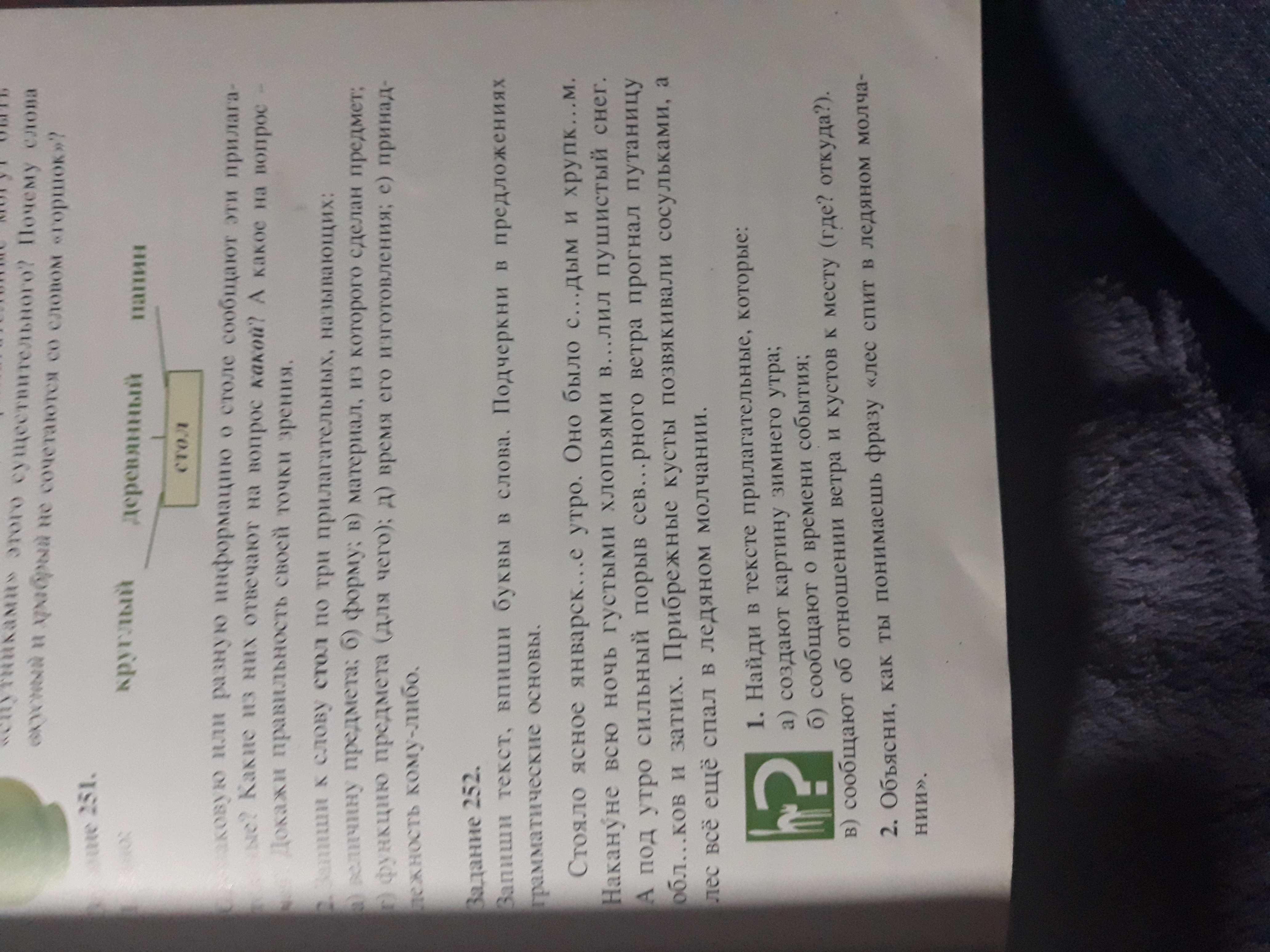 /Стояло/ ясное январское (утро). (Оно) /было/ седым и хрупким. Наконуне всю ночь густыми хлопьями /валил/ пушистый (снег). А под утро сильный (порыв) северного ветра /прогнал/ путаницу облаков и /затих/. Прибрежные (кусты) /позвякивали/ сосульками, а (лес) еше /спал/ в ледяном молчании.