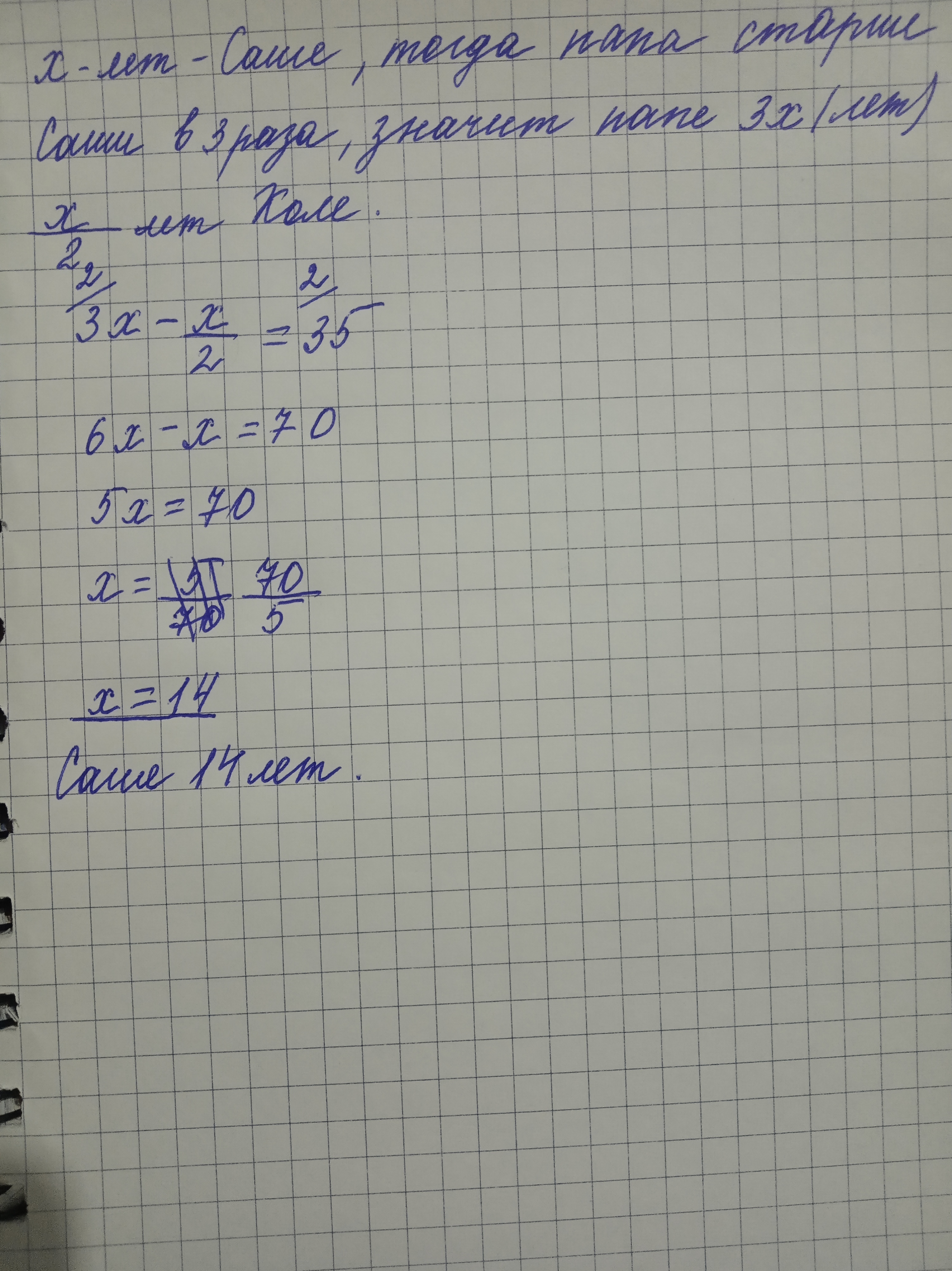 Саша в 3 раза моложе папы и в 2 раза старше брата Коли. Сколько лет Саше, если Коля моложе папы на 35 лет? Плз