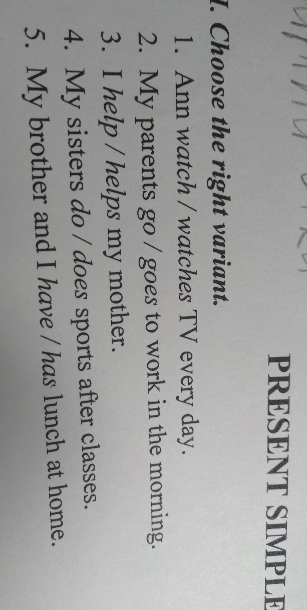 1. Watches. 2. Go. 3. Help. 4. Do. 5. Have.