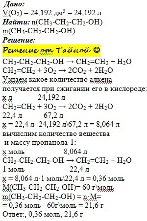 на сжигание алкена,полученного в реакции дегидратации пропанола-1,израсходован кислород объемом 24,192дм.определите количество пропанола-1