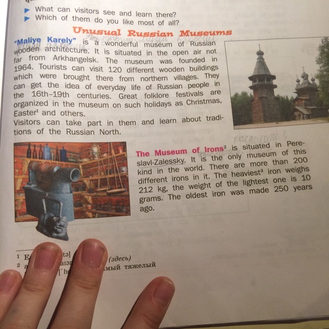 Необычные русские музеи - «Малые карелы» - это удивительный музей русского деревянного зодчества. Он расположен под открытым небом недалеко от Архангельска. Музей был в 1964 году. Туристы могут посетить 120 различных деревянных зданий, привезенных туда из северных сел. Идея повседневной жизни русских людей в XVI-XIX веках. На Пасху и др. организуются великие фольклорные фестивали. Посетители могут принять в них участие и познакомиться с традициями, основанными в музее в такие праздники, как рождественские праздники Русского Севера. Музей «Утюги» находится в Переславе-Залесском. Это единственный в мире музей такого типа. В нем более 200 различных утюгов. Самый тяжелый утюг весит 212 кг, а вес самого легкого - 10 грамм. Самое старое железо было сделано 250 лет назад.