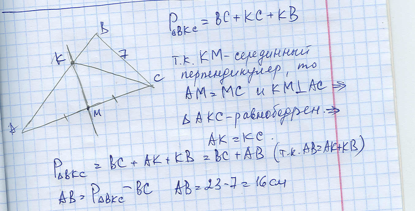Серединный перпендикуляр стороны АС треугольника АВС пересекает его сторону АВ в точке К. Найдите сторону АВ треугольника АВС, если ВС=7 см, а периметр треугольника ВКС равен 23 см.