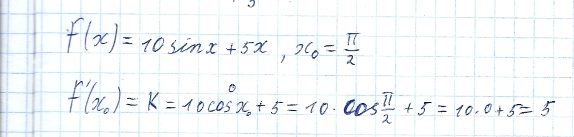 Вычисли угловой коэффициент касательной к графику функции f(x)=10sinx+5x в точке с абсциссой x0=π/2. С решением, пожалуйста