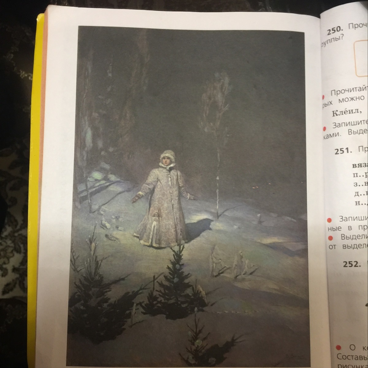 Предо мной картина «автор» «название». Картина описывает девочку которая заблудилась в зимнем лесу ища свою вещичку. Она одета в белую одежду: шуба и шапка. По окраске леса видно, что на дворе зима. Некоторые деревья все ещё не покрылись снегом.
