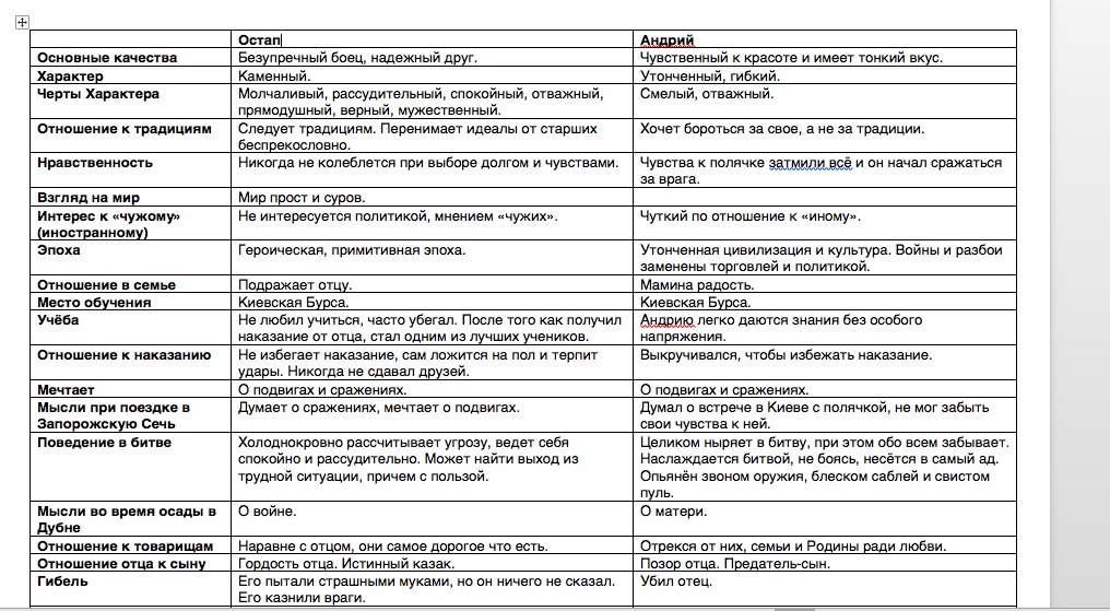 Надо сравнить Остапа и Андрия из повести Тарас Бульба в виде таблицы! Очень срочно!!! Помогите пожалуйста