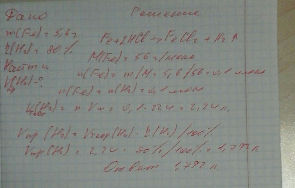 Сколько литров водорода выделится при взаимодействии 5,6 г железа с соляной кислотой если выход реакции составляет 80 %
