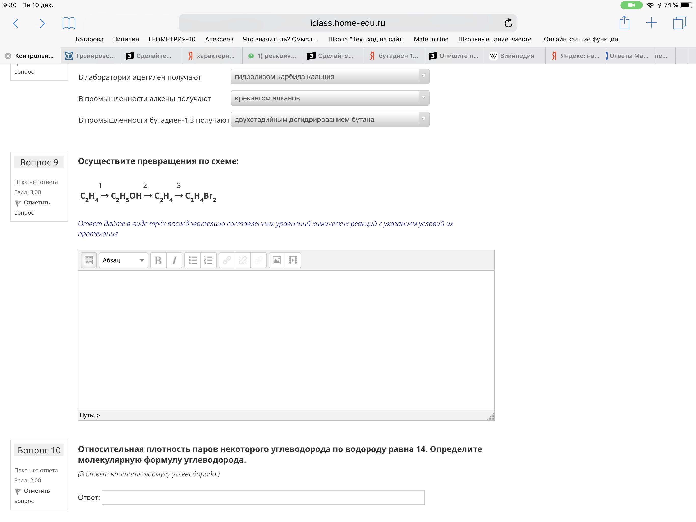 C₂H₅OH ----> C₂H₄ + H₂O (Kt=H₂SO₄,t≥180С)