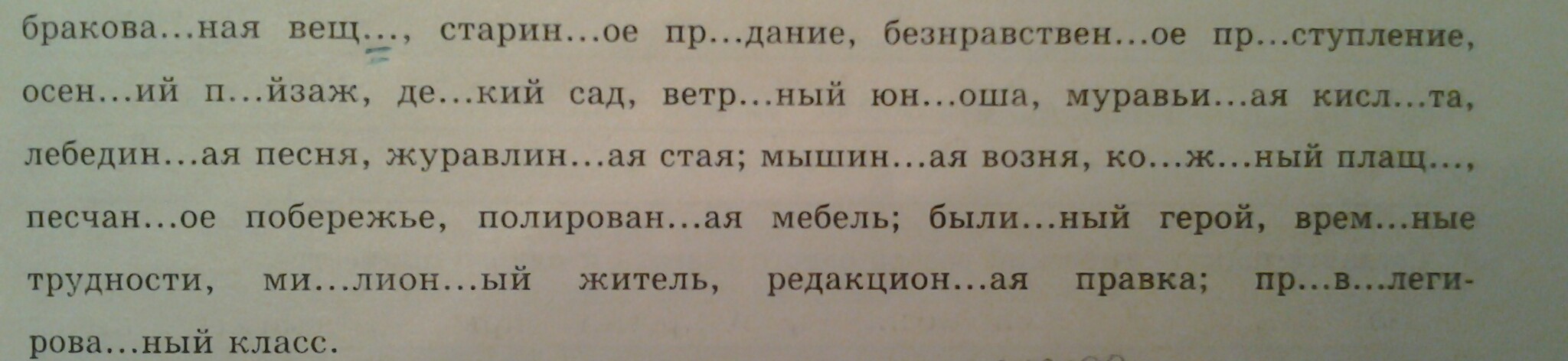 бракованная вещь,старинное придание,безнравственное преступление,осенний пейзаж,детский сад,ветреный юноша,муравьиная кислота,лебединая песня,журавлиная стая,мышиная возня,кожаный плащ,песчаное побережье,полированная мебель,былинный герой,временные трудности,миллионный житель,редакционная правка,привилегированный класс