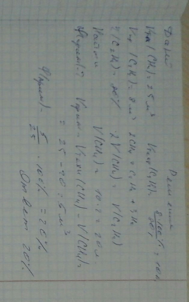 термическим разложением 25м3 метана было раздобыто 8м3 ацетилена(нормальные условия). Посчитайте массовую долю примесей в метане, если относительный выход ацетилена равен 80%
