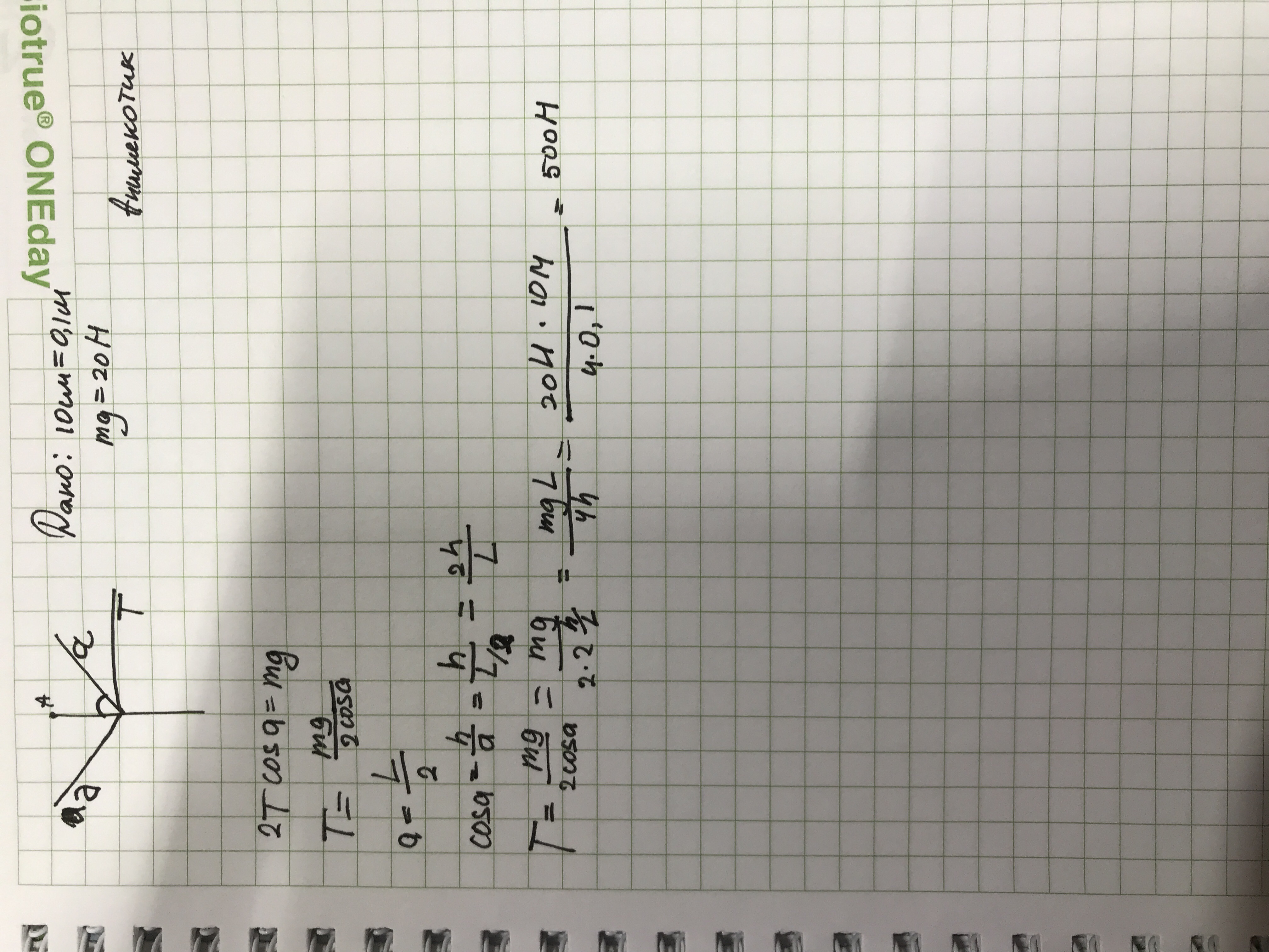 МНОГО БАЛЛОВ! ПОМОГИТЕ!На верёвке для сушки белья длиной 10 м висит костюм весом 20Н. Прищепка, держащая костюм, находится в центре верёвки и на 10 см ниже горизонтальной линии, соединяющей точки крепления веревки. Найдите силу натяжения веревки.