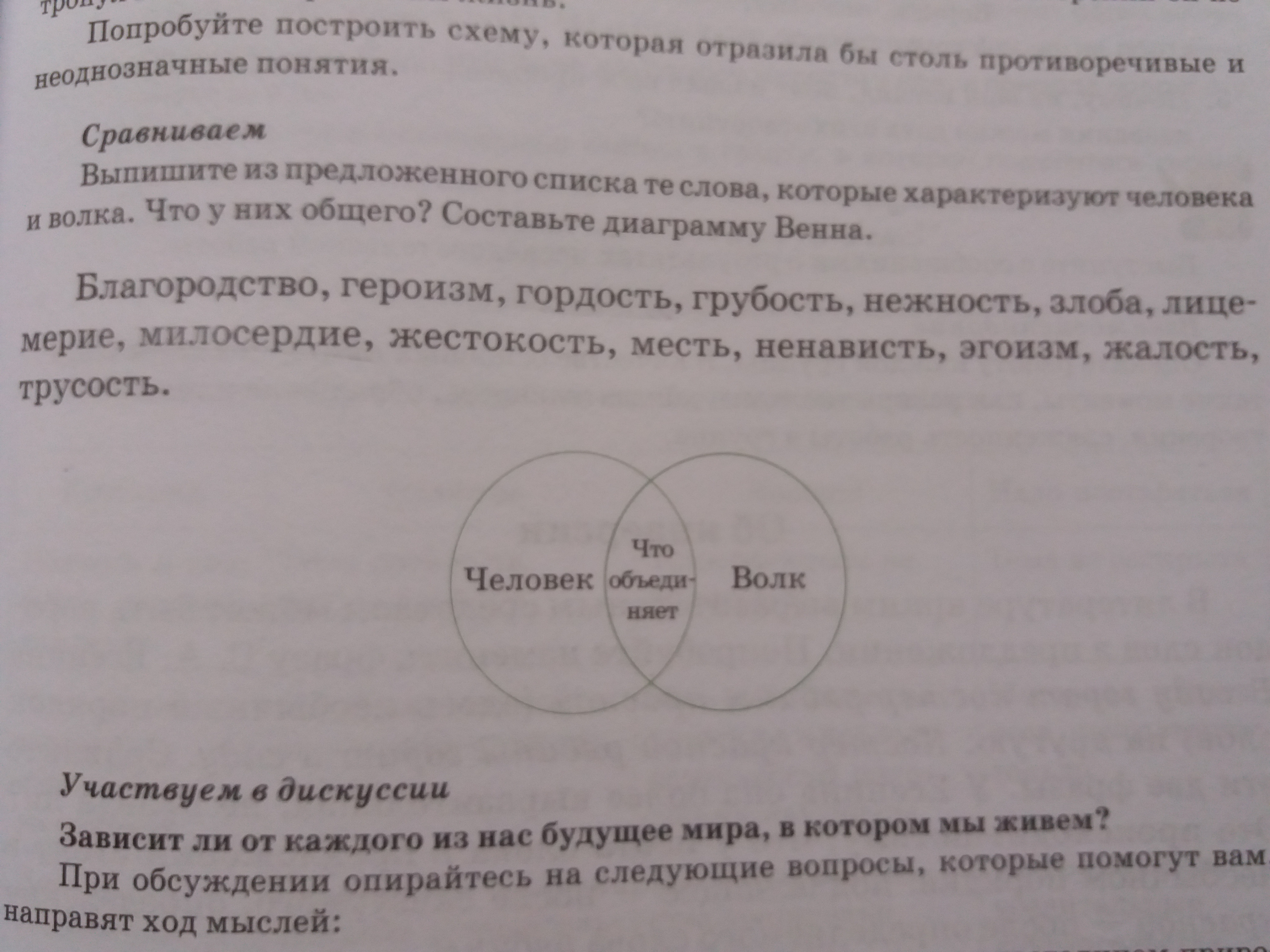 Выпишите из предложенного списка те слова, ко нрав характеризуют человека и волка. Что у них общего? Составьте диаграмму Венна.
