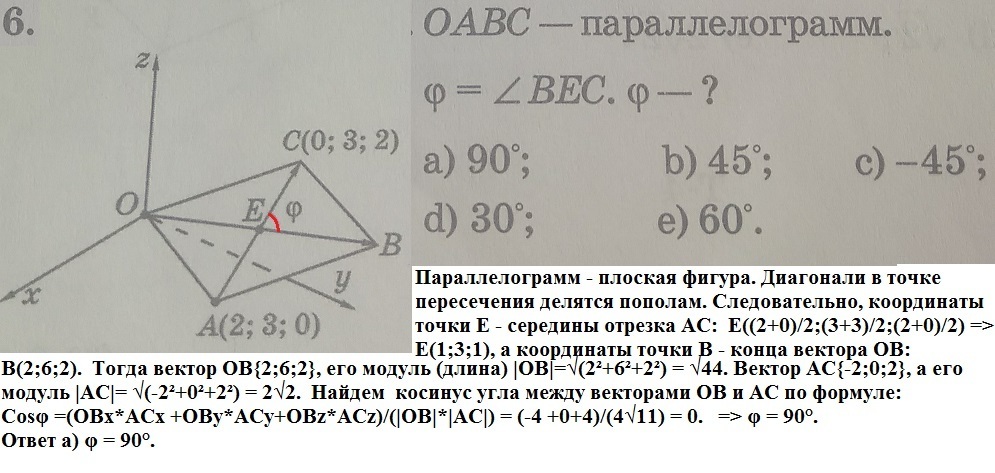 Параллелограмм - плоская фигура. Диагонали в точке пересечения делятся пополам. Следовательно, координаты точки Е - середины отрезка АС: Е((2+0)/2;(3+3)/2;(2+0)/2) => Е(1;3;1), а координаты точки В - конца вектора ОВ(2;6;2). Тогда вектор ОВ{2;6;2}, его модуль (длина) |OB|=√(2²+6²+2²) = √44. Вектор AC{-2;0;2}, а его модуль |AC|= √(-2²+0²+2²) = 2√2. Найдем косинус угла между векторами ОВ и АС по формуле: