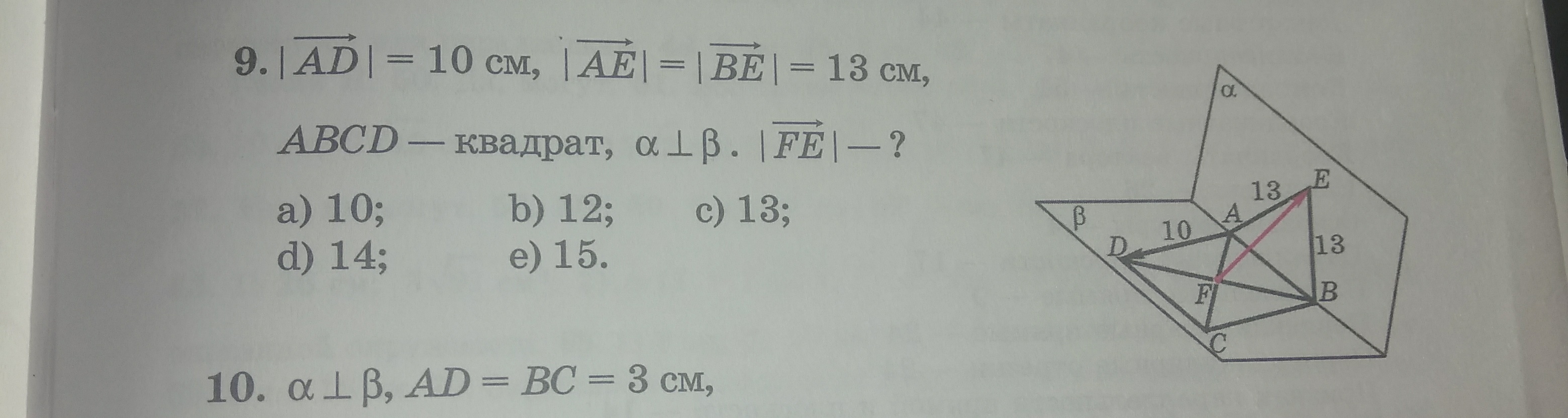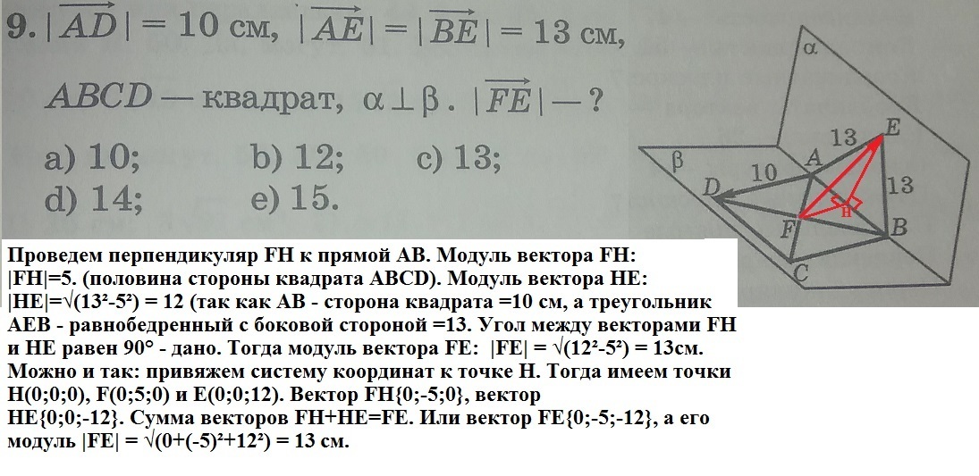 9. Проведем перпендикуляр FH к прямой АВ. Модуль вектора FН: |FН|=5. (половина стороны квадрата ABCD). Модуль вектора НЕ: |HE|=√(13²-5²) = 12 см (так как АВ - сторона квадрата =10 см, а треугольник АЕВ - равнобедренный c боковой стороной =13 см. Угол между векторами FH и НЕ равен 90° - дано. Тогда модуль вектора FE: |FE| = √(12²-5²) = 13см.