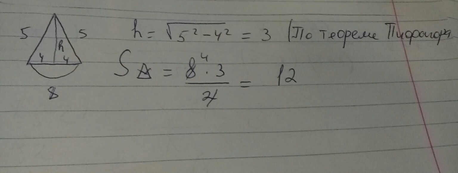 Основание равнобедренного треугольника равно 8 см. Боковая сторона 5 см, найдите площадь треугольника