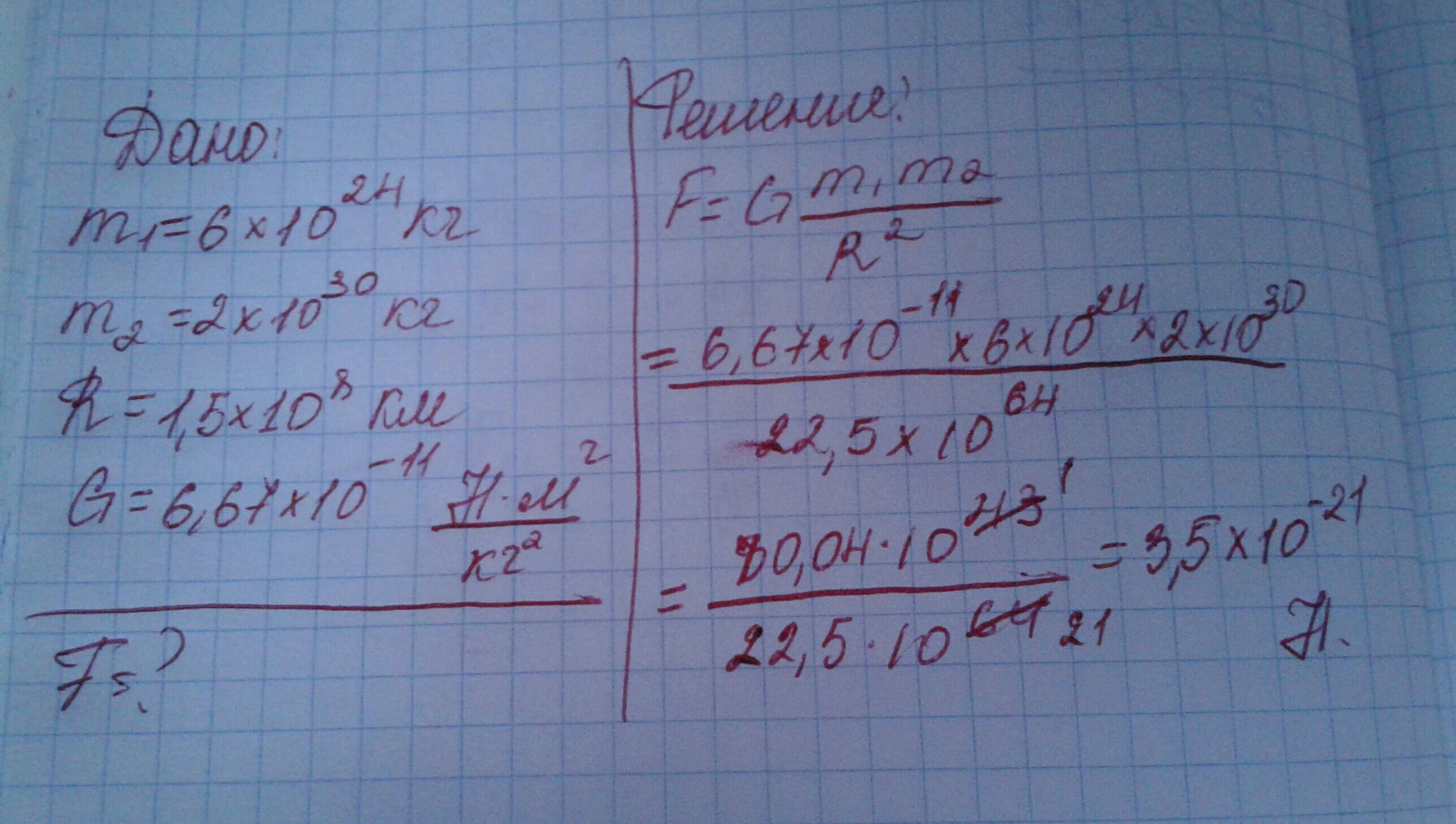 Масса Земли 6*10^24 кг, масса Солнца 2*10^30 кг. С какой силой они взаимодействуют, если среднее расстояние между ними 1,5*10^8 км (G= 6,67*10^-11 Н*М^2/кг^2). Можете пожалуйста полное решении со всеми формулами. Пожалуйста срочно.
