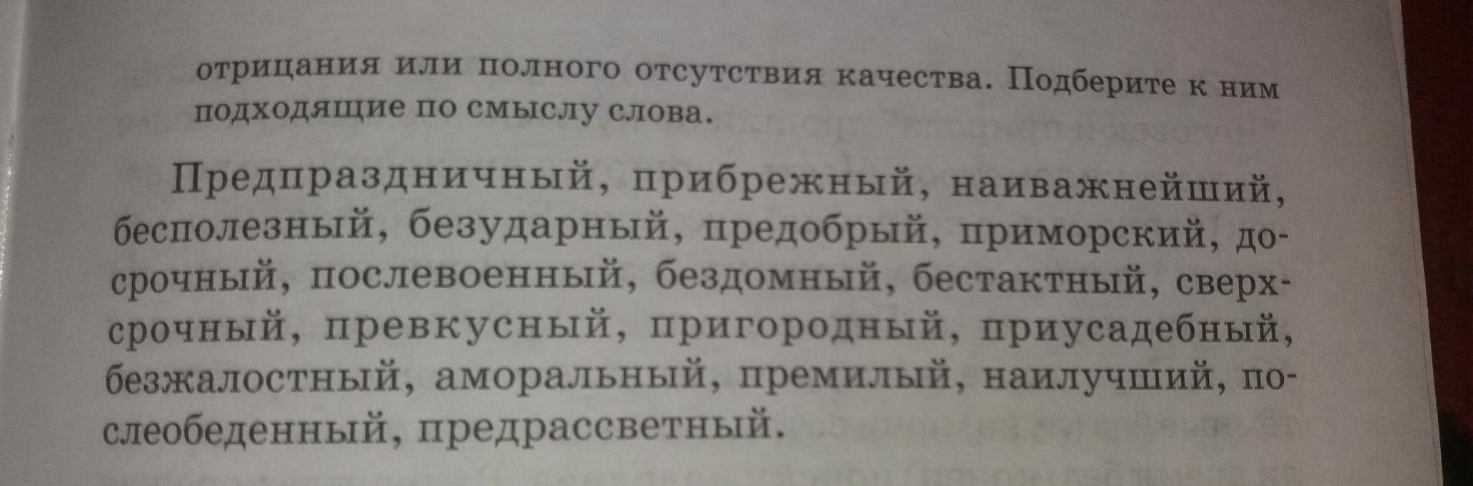 Предпраздничный концерт, прибрежный округ, наиважнейший элемент, бесполезный совет, безударный гласный, предобрый старик, приморский город, досрочный выход, послевоенный кризис, бездомный кот, бестактный человек, сверхсрочный уход, превкусный пирог, пригородный посёлок, приусадебный сад, безжалостный ребенок, аморальный поступок, премилый батюшка, наилучший выбор, послеобеденный сон, предрассветный туман