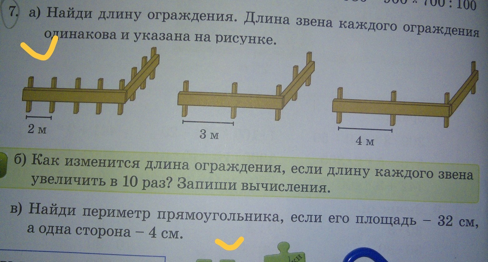 Длина каждой части ограды увеличится в 10 раз , значит длина всего ограждения увеличится тоже в 10 раз Например 1)2+2+2+2 =8. 8*10*2 = 160. (2*10+2*10+2*10+2*10)*2=160. 2)3+3=6. 6*10*2=120. 3)4+4+4= 12. 12*10= 120. 4) b=S /a = 32/ 4=8 см >> Pтреуг.= 2*8+ 2*4=24 см