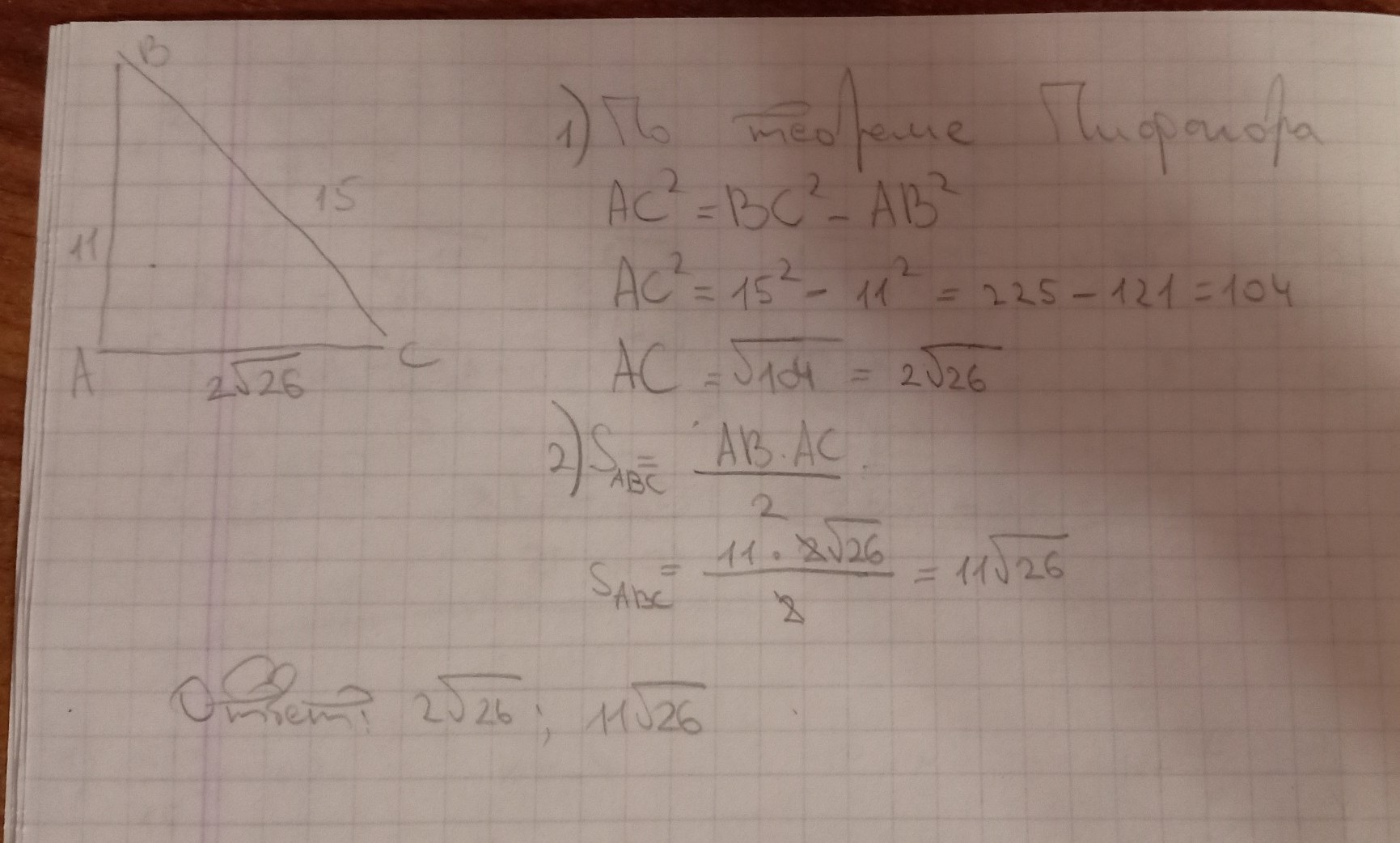 СРОЧНО!!!один из катетов прямоугольного треугольника равен 11 см а гипотенуза 15 см найдите второй катет и площадь треугольника