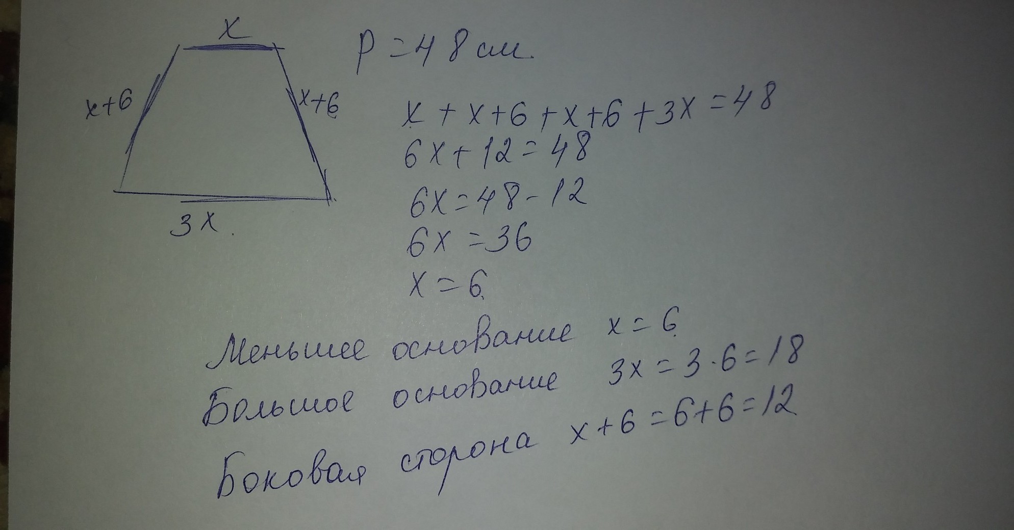 Периметр равнобедренной трапеции равен 48 см. Большее основание в 3 раза больше меньшего основания. Боковая сторона на 6 см больше, чем меньшее основание. Вычисли длины сторон трапеции.