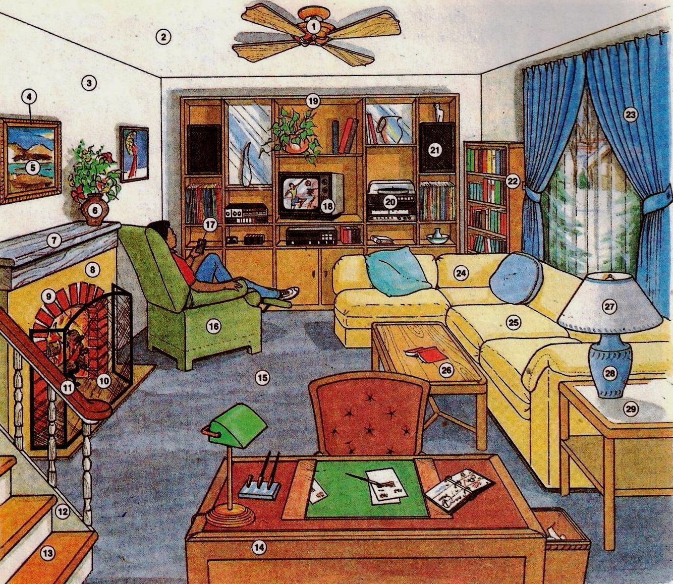 There is a yellow sofa.There are two lamps.There are 2 pictures.There are many books.There are two plants.There are 3 pens.There's television.There's window.There's bookshelf.There are two pillows.There's green armchair.There's red chair.There are two tables.