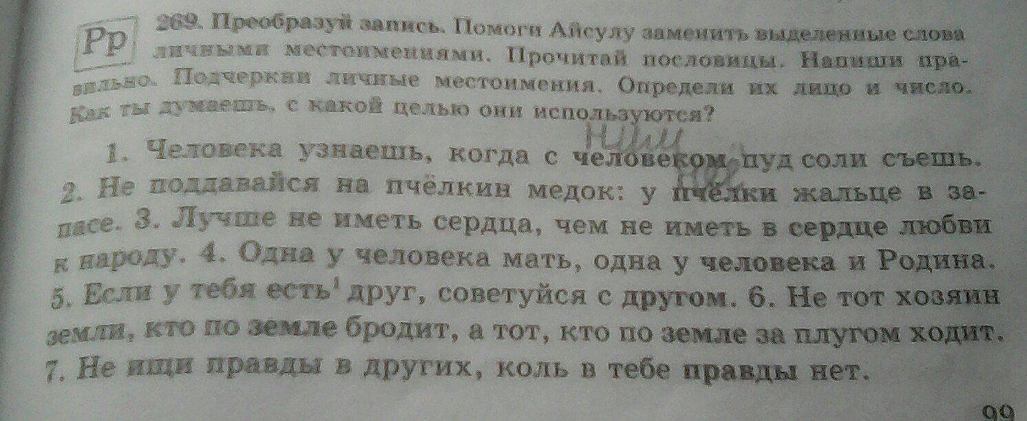 Преобразуй запись Помоги Айсулу заменить выделенные слова личными местоимениями . Прочитай пословицы. Напиши правильно . Подчеркни личные местоимения. Определи их лицо и число . Как ты думаешь , с какой целью они используются ?