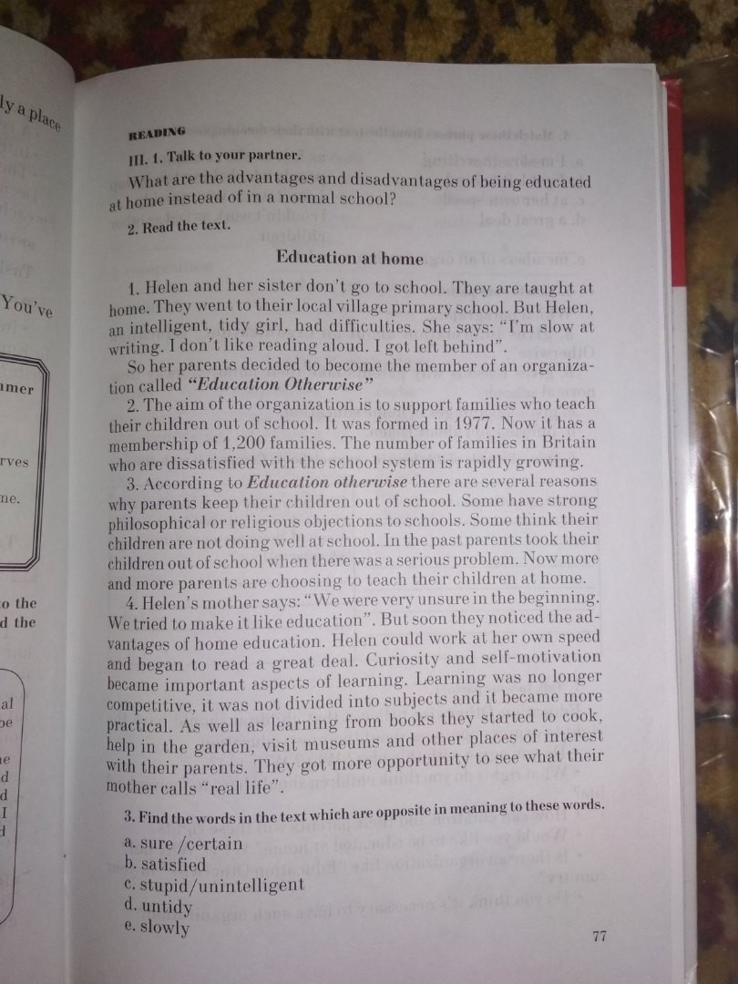 1. Хелен и ее сестра не ходят в школу. Они обучаются дома. Они ходили в местную деревенскую начальную школу. Но у Хелен, умной, аккуратной девочки, возникли трудности. Она говорит: "Я медленно пишу. Не люблю читать вслух. Я плелась в хвосте".
