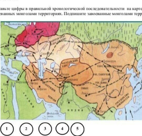 Поставьте цифры в хронологическом порядке от 1 до 5 на карте завоеванной монголами территории, подпишите.