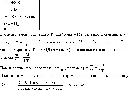 Азот, который находится в баллоне , под давлением 2 МПа и температурой 400К .Найти обьем баллона ! (В ходе вычислений смог найти плотность, она 16,8 кг/м^3, если это как то поможет)