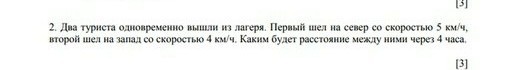 Направления их движения взаимно перпендикулярны, т.е. расстояние между туристами через 4 часа - это гипотенуза прямоугольного треугольника со сторонами 20 км и 16 км