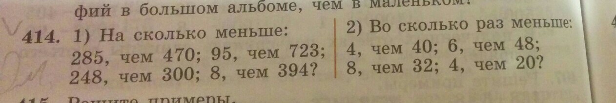 Легко! 1) 285 меньше 470 на 185, 95 меньше 723 на 628, 248 меньше 300 на 52 ,8 меньше 394 на 386 2) 4 меньше 40 в 10 раз, 6 меньше 48 в 8 раз, 8 меньше 32 в 4 раза, 4 меньше 20 в 5 раз