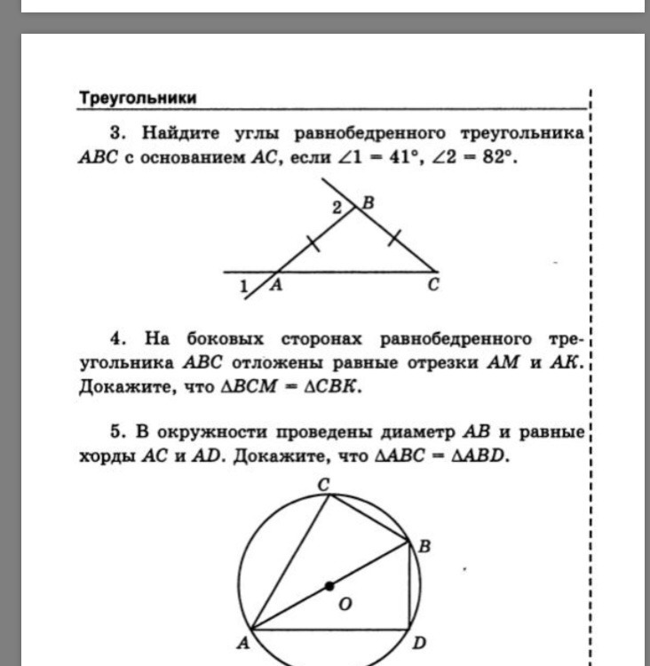 3. т.к. развернутый угол равен 180 градусам, то угол В=180-82=98 (т.к. угол 2=82 градусам по условию) т.к. тр-к АВС равнобедренный, то угол А равен углу С, тогда угол А=С=(180-98(угол С))/2=41