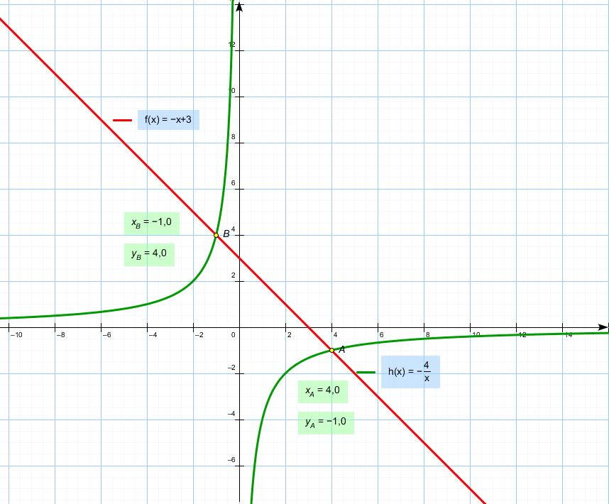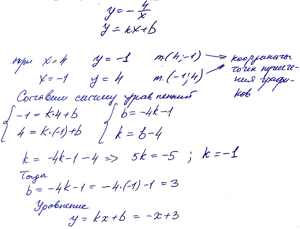 Блин,ребят помогите пожалуйста!найдите значения K и b, если абсциссы точек пересечения графиков функций у=-4:х и у=кх+b равны 4 и -1.Постройте графики этих функций на одной координатной плоскости!Можно не чертить!Просто точки!Умоляю, помогите мне!Отмечу как лучшее