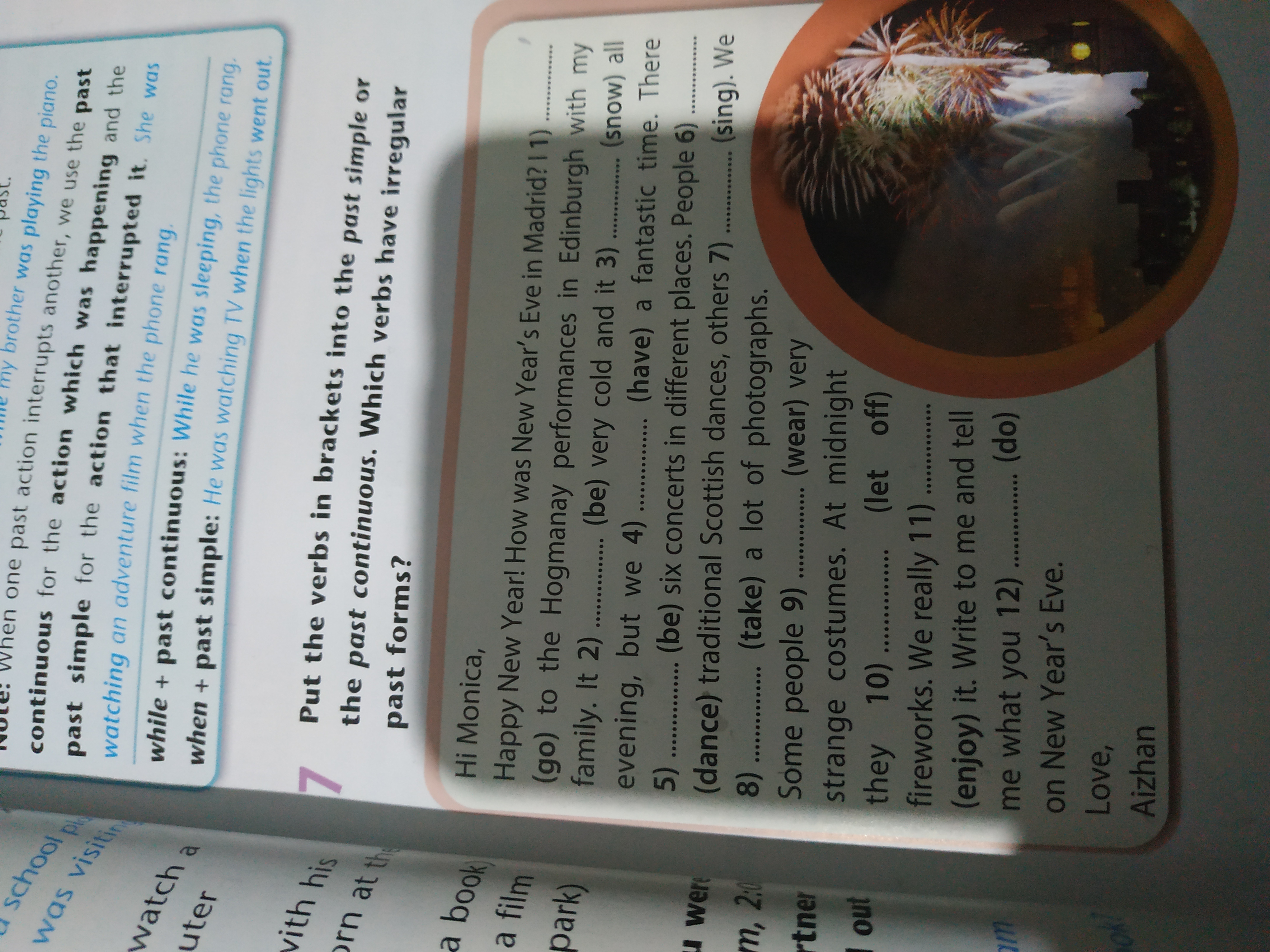 Положите глаголы в скобках в прошлое, простое или в прошлое, непрерывное. Какие глаголы имеют неправильные формы прошлого? Привет Моника С Новым Годом! Как прошел канун Нового года в Мадриде? 11) (пойти) на выступления в Хогманай в Эдинбурге с моей семьей. Это 2 (быть) очень холодно и это 3) вечером, но мы 4) (есть) фантастическое время. Там снег) всего (быть) шесть концертов в разных местах. Люди 6 (танцуют) традиционные шотландские танцы, другие 7) .. 8 (делают) много фотографий Некоторые люди 9 ... (носят) очень странные костюмы. В полночь у них 10 (пускай) фейерверков. Мы действительно 11) (наслаждайтесь) этим. Напиши мне и скажи, что ты 12 .. делаешь в канун Нового года. Любовь Айжан сингл.