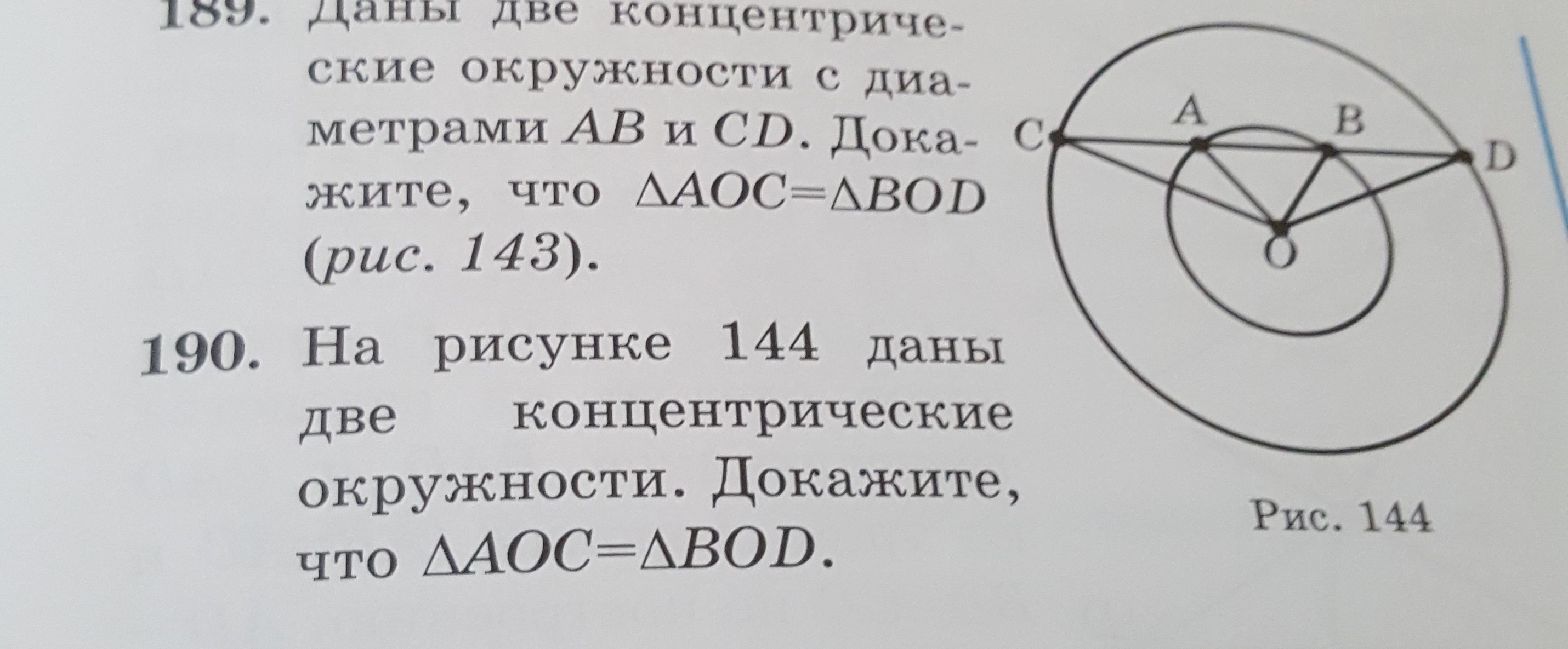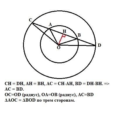 Проведем перпендикуляр ОН к хорде CD. По свойству этого перпендикуляра хорды АВ и СD точкой Н делятся пополам. Следовательно, АН=ВН и СН=DH. АС=СН-АН и BD=DH-BH. Значит АС=BD как разность одинаковых величин. => Треугольники АОС и BOD равны по трем сторонам: ОС=ОD и АО=ВО как радиусы, ФС=BD - доказано выше. Что и требовалось доказать.