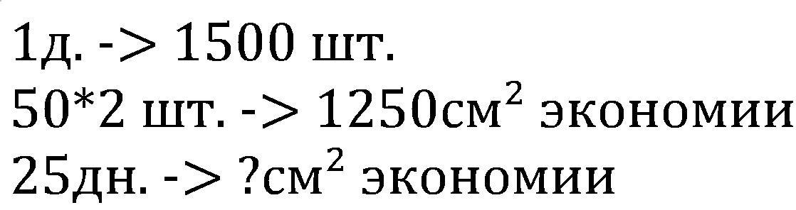 Помогите составить краткую запись к задаче или схему (без решения) Благодаря рационализатарскому предложению удалось сэкономить на каждых 50 парах ботинок 1250 квадратных см кожи. Сколько кожи сэкономлено за 25 рабочих дней, если каждый день выпускается 1500 ботинок?