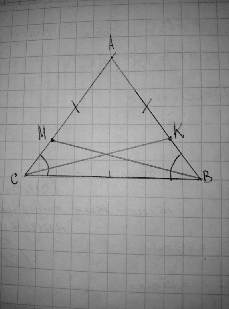 На боковых сторонах равнобедренного треугольника ABC отложены равные отрезки АМ и АK.Докажите,что треугольник BCM = треугольнику CBK.