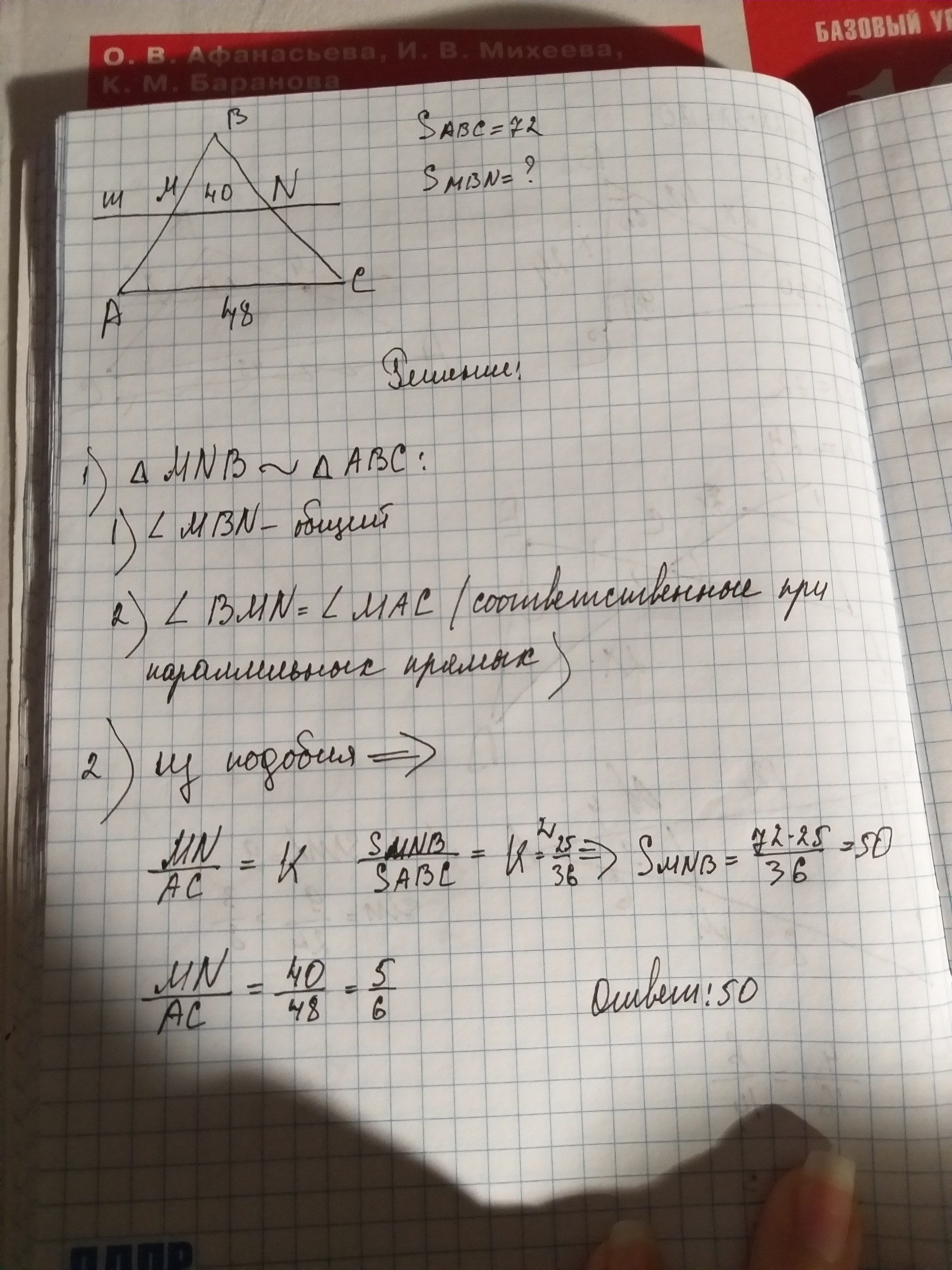 прямая параллельная стороне АС треугольника АВС пересекает стороны АВ и ВС в точках М и N