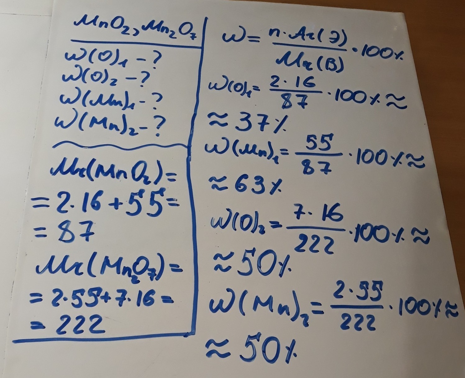 Вычеслите массовую долю(%)каждого элемента в соеденениях марганца (4) и марганца (7) с кислородом.