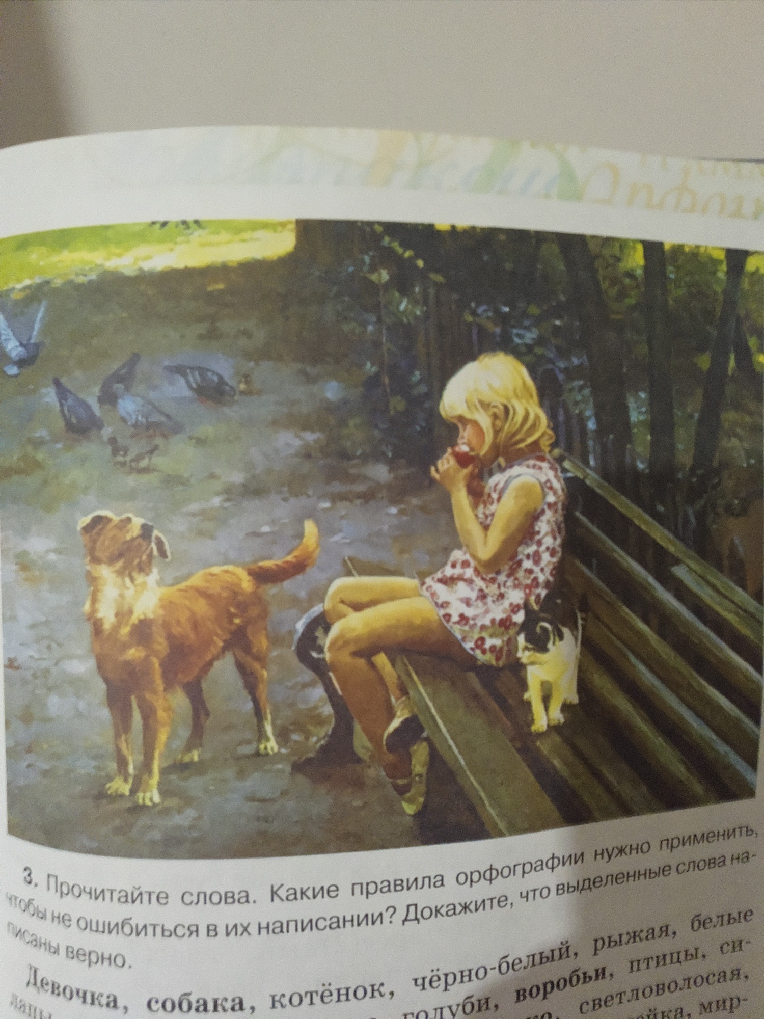 На лавочке сидит девочка, она ест красное яблоко. Погода хорошая и ей хорошо (скорее всего дело было летом) поэтому девочка в платице и туфельках. Она добрая, поделилась с собакой и котом поэтому они смело к ней подходят. Голуби резвятся не подалёку, их кто-то покормил. Девочка сидит под кровами деревьев поэтому на неё не падают лучи света.