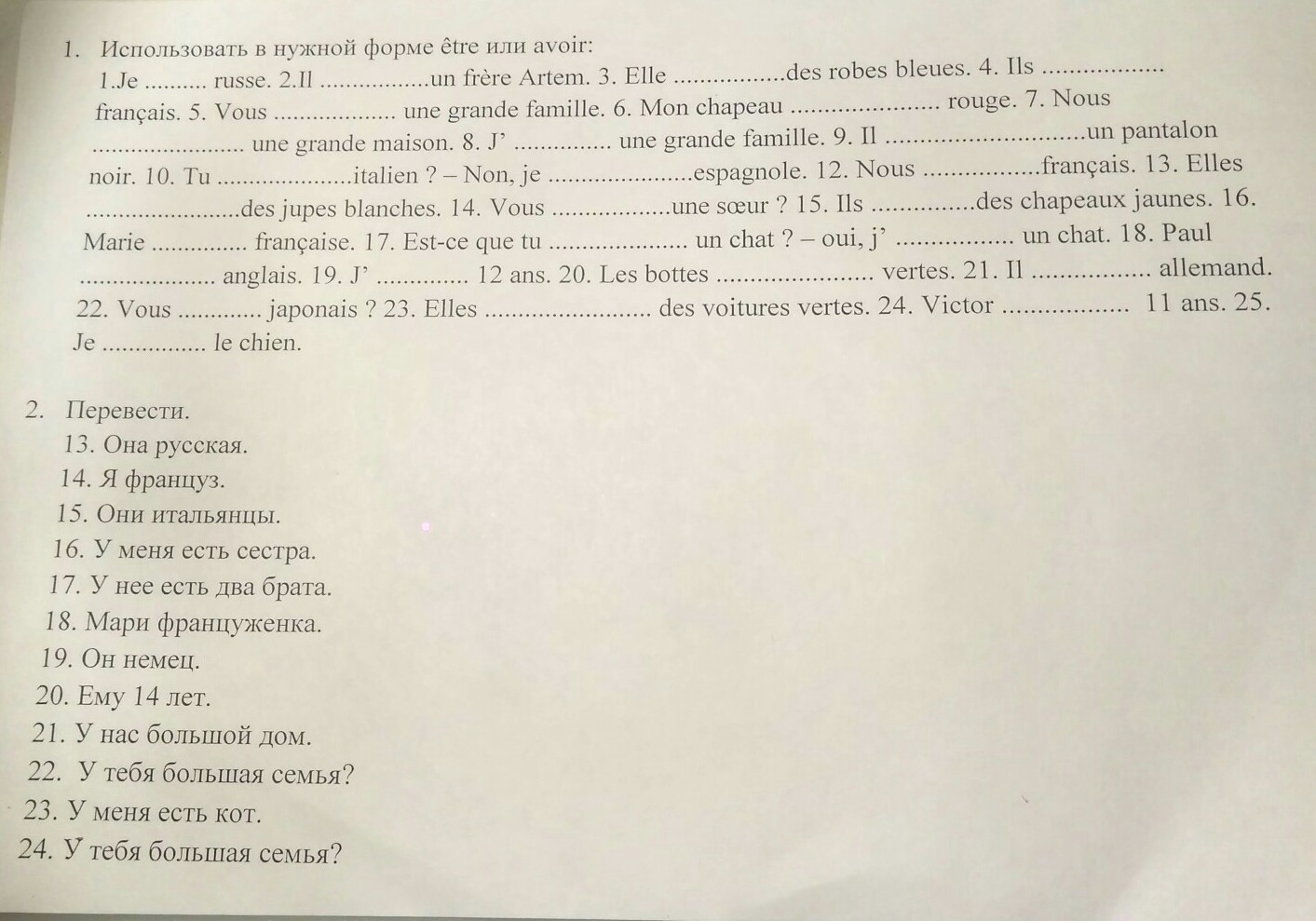 13. Elle est Russe. 14. Je suis Français. 15. Ils sont Italiens. 16. J'ai une soeur. 17. Elle a deuz frères. 18. Marie est Française. 19. Il est Allemand. 20. Il a 14 ans. 21. Nous avons une grande maison. 22. Tu as une grande famille? 23. J'ai un chat. 24. As-tu une grande famille?