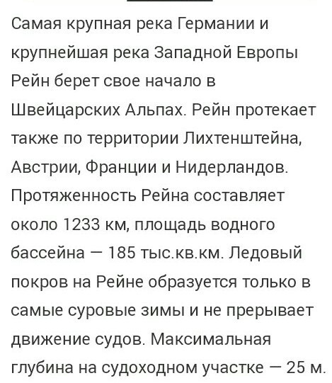 Германиядағы ең ірі өзен және Батыс Еуропаның ең үлкен өзені, Рейн Швейцария Альпі.Рейн сондай-ақ Лихтенштейн, Австрия, Франция және Нидерланды аумақтары арқылы өтеді.Рейннің ұзындығы шамамен 1223 км, су бассейнінің ауданы-185 мың шаршы км. құрайды.
