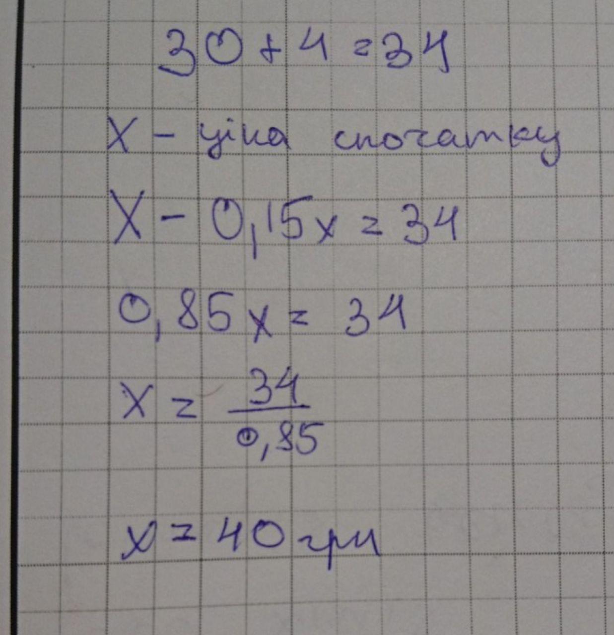 Ціна книги спочатку була знижена на 15%, а потім ще знизилась на 4 грн. Після двох знижок книга коштувала 30 грн.Скільки коштувала книга спочатку?