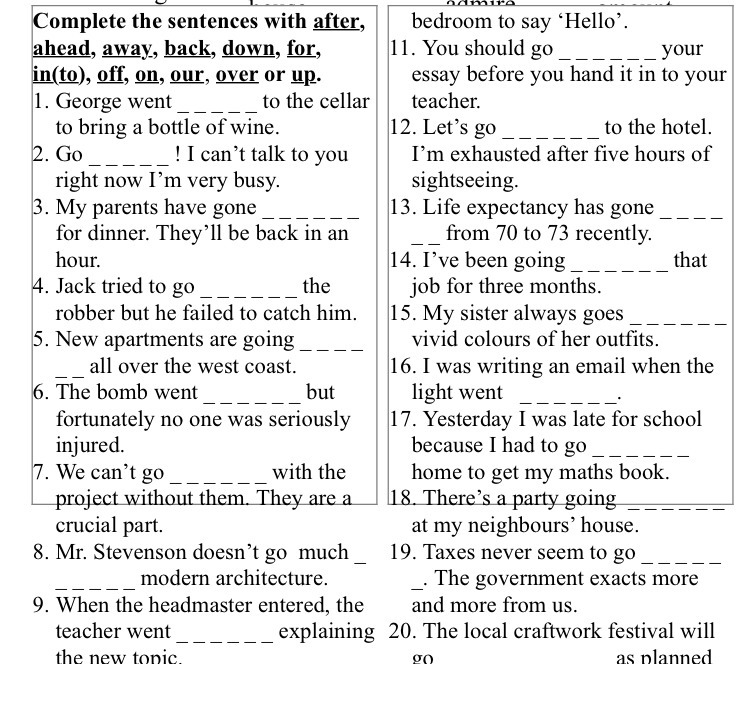 1) on, 2 out 3) on 4) off 5) in 6) off 7) on 8) in 9) over up 10) in 11) of 12) in 13) away 14) in 15) on 16) over up 17) in 18) on 19) in 20) off
