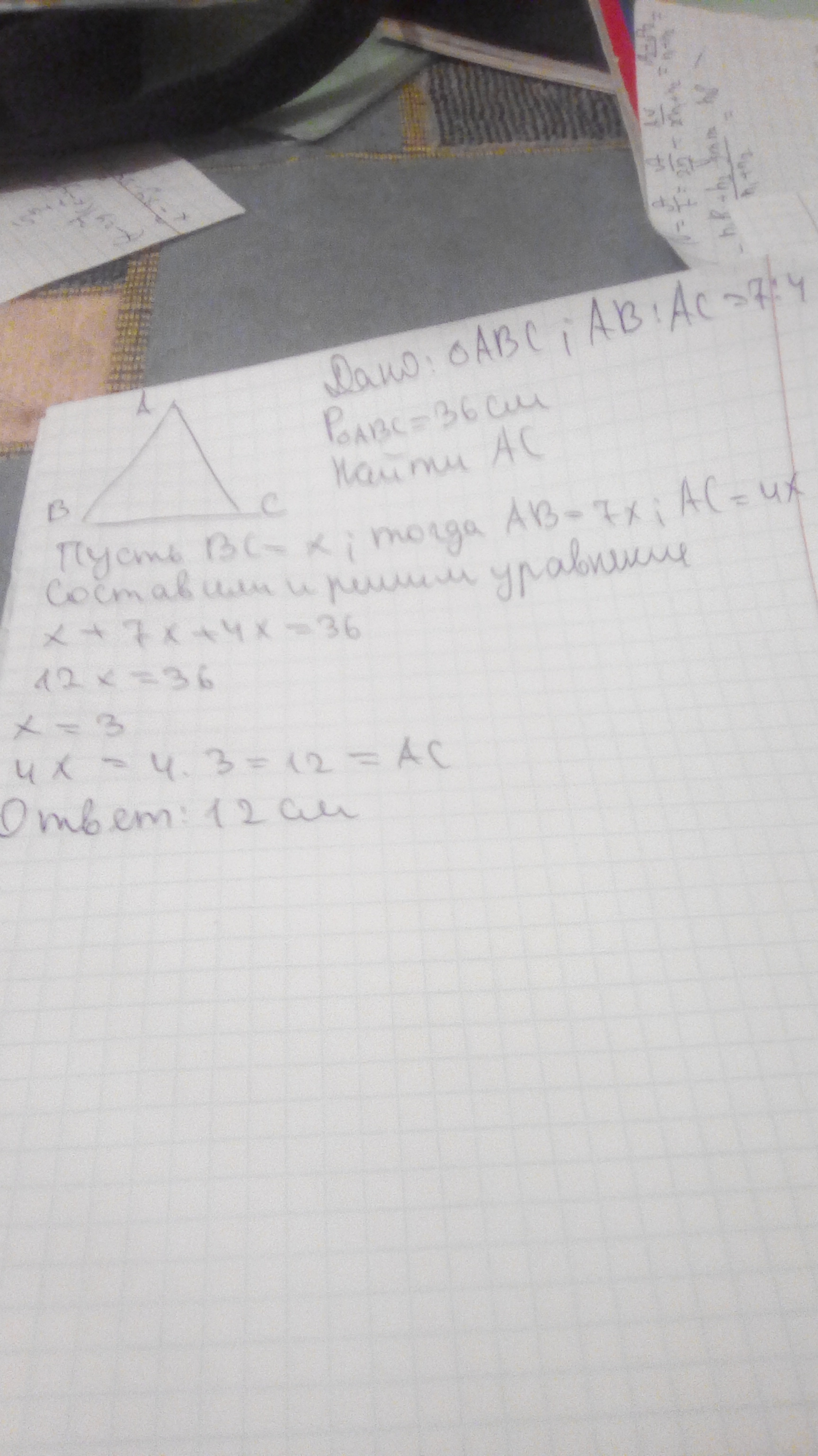 Известно ,что отношение между сторонами АС и АВ = 7:4, а периметр = 36 см. Значит, чтобы найти сколько см в 1 части нужно 36:(7+4+1)=3.(1 это сколько частей на стороне ВС).Потом т.к у АС 4 части, то 3*4=12 см .