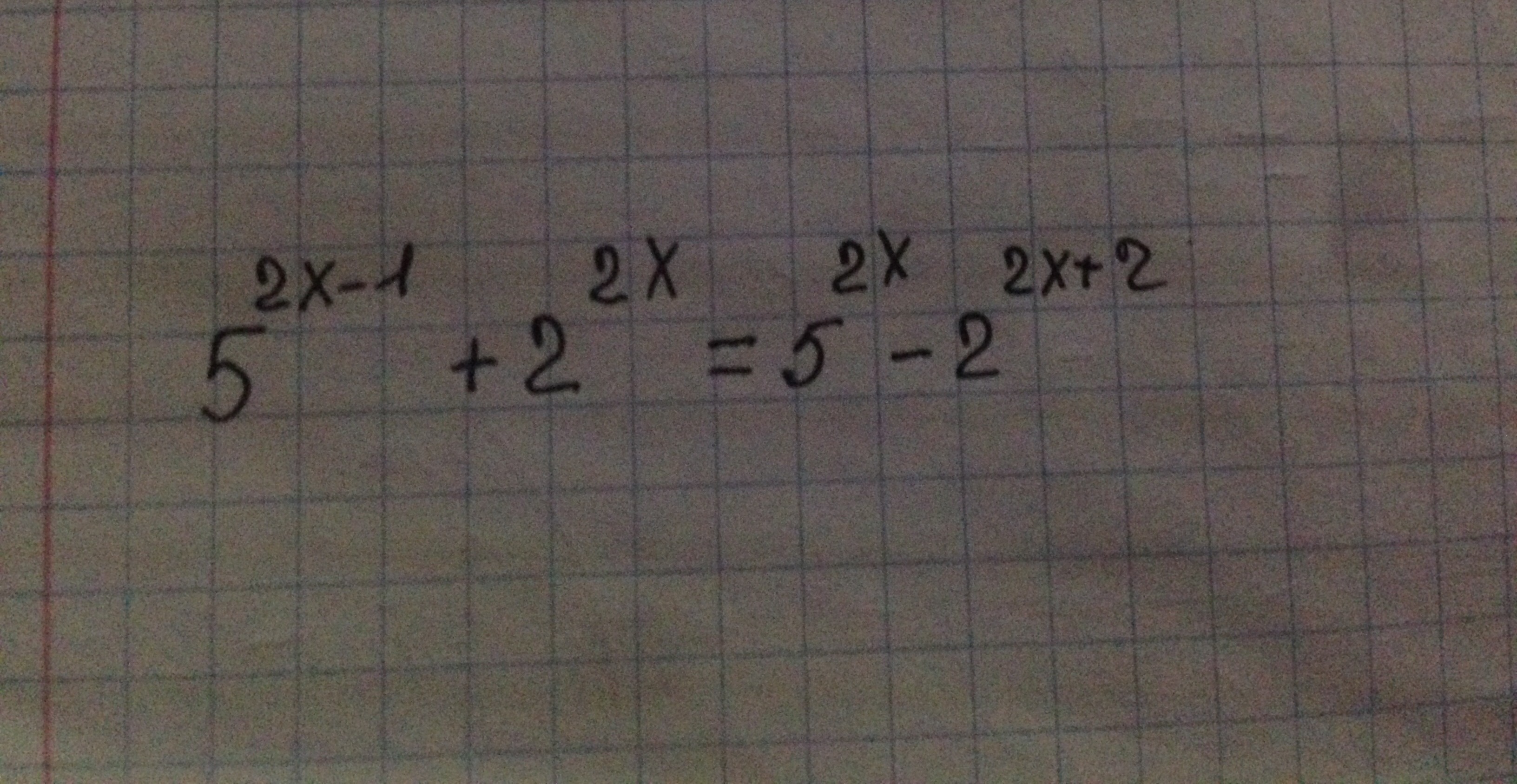 5^{2x - 1} + 2^{2x} = 5^{2x} - 2^{2x + 2}\frac{5^{2x}}5 + 2^{2x} = 5^{2x} - 4*2^{2x}\5*2^{2x} = frac45*5^{2x}\(frac25)^{2x} = frac4{25} = (frac25)^2\2x = 2\x = 1