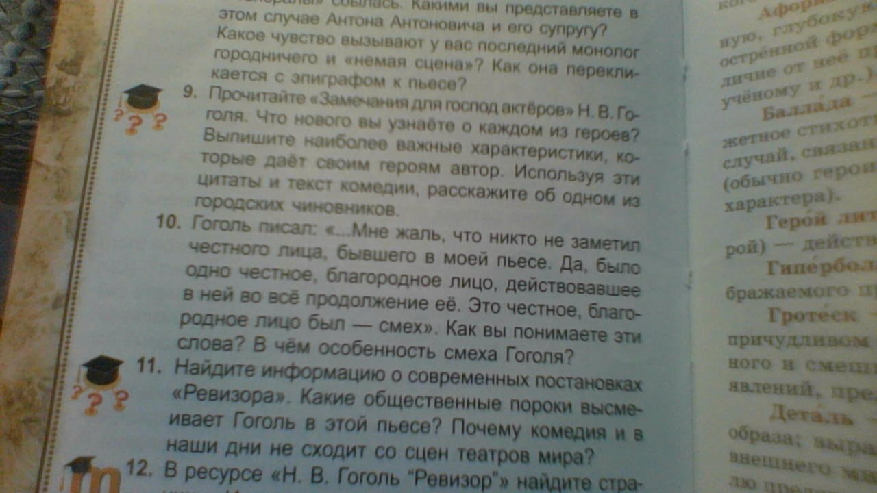 Н. В. Гоголь, отвечая на упреки критиков, что в пьесе «Ревизор» нет ни одного положительного лица, писал: «Мне жаль, что никто не заметил честного лица, бывшего в моей пьесе; это честное, благородное лицо был — смех» . И далее Гоголь выступает его защитником: «Нет, смех значительней и глубже, чем думают. Не тот смех, который порождается временной раздражительностью, желчным, болезненным расположением характера; не тот также легкий смех, служащий для праздного развлечения и забавы людей, — но тот смех, который весь излетает из светлой природы человека» . Именно такой смех вызывает Гоголь своим «Ревизором» .